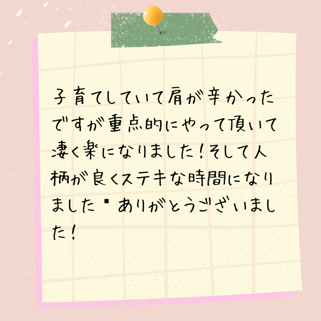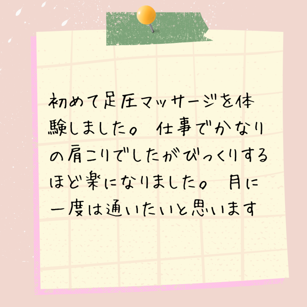 私も『谷川流足圧』を受けるお客様でした。私は酷い肩凝りで長年悩まされてきました。いろいろなマッサージにもたくさん通いましたが、その時は良くなるが、いまいちもう一つ物足りなさをいつも感じていました。そんな時この谷川流足圧を初めて受けて、今まで味わった事のない痛気持ち良さ、施術が終わっての身体の軽さに感動したのを昨日のように覚えています。一人でも多くの方にこの感動をお伝えしていきたいです。皆様のご来店心よりお待ちしております^_^